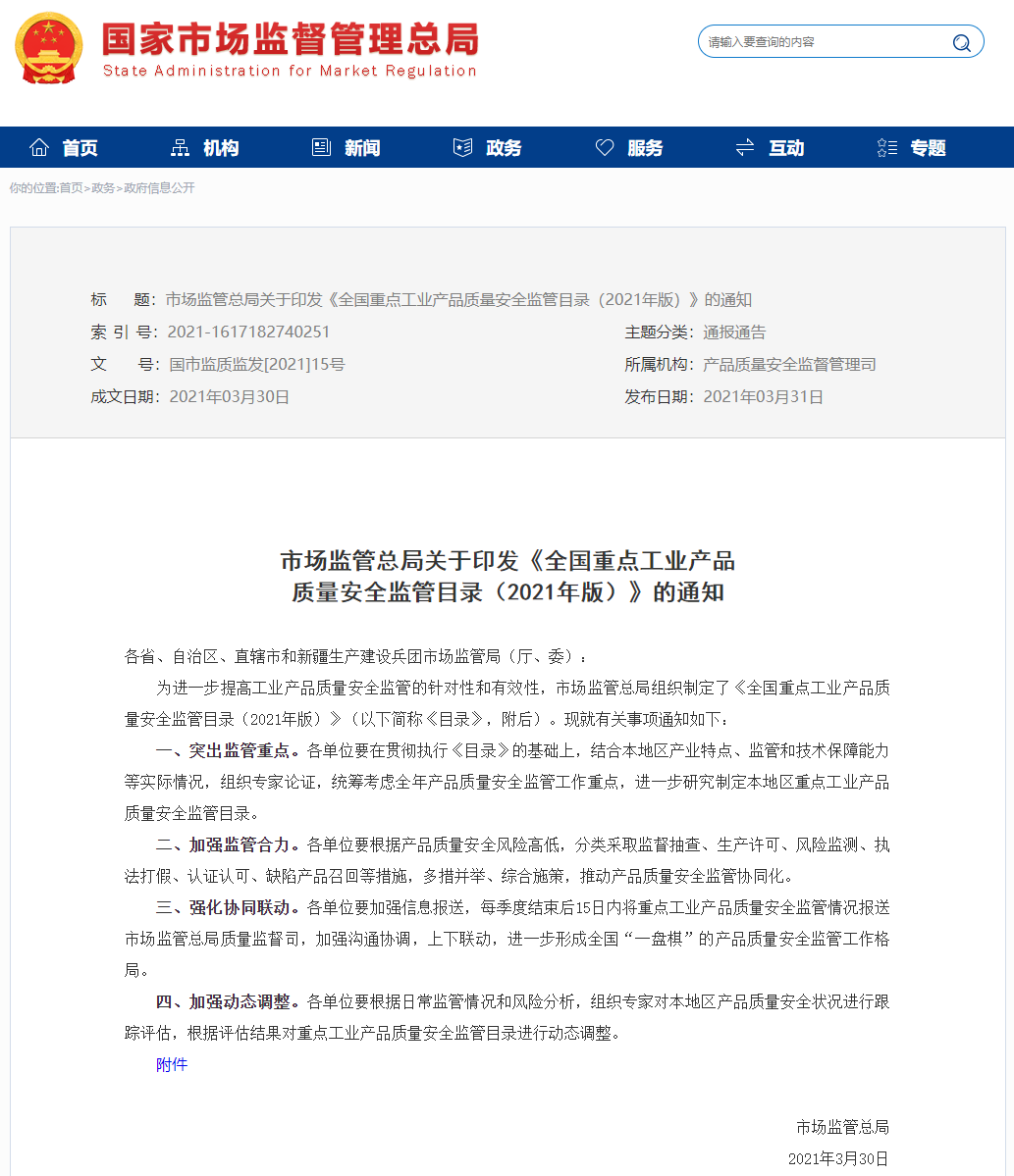 原文链接:http://gkml.samr.gov.cn/nsjg/zljdj/202103/t20210331_327449.html
